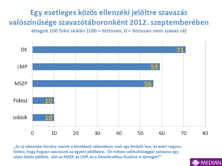 A Medián kutatása nem azt a kérdést teszi fel, hogy az LMP beolvadjon-e a Bajnai-féle szervezetbe, hanem, hogy szavazna-e valamiféle közös jelöltbe. A novemberi döntés után Schifferék elmondták, hogy hajlandóak tárgyalni (az új választási rendszer miatt muszáj is), de nem akarnak BELÉPNI Bajnaiékhoz. A két dolgot előszeretettel mossák össze a ballib sajtóban, de közel sem ugyanaz. Attól még, hogy az LMP saját név alatt indul, simán lehet olyan egyeszséget kötni, ami alapján például nem indítanak egymás ellen jelölteket a körzetekben. Az is egy "közös jelöltre" való szavazás, nemde? Csak ezt az együttműködést meg Bajnaiék zárták ki (azzal, hogy azt mondták, hogy majd akkor ők az LMP nélkül képviselik az LMP érdekeit, Kónya megnyilatkozásairól meg nem is beszélve).